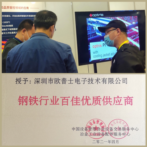 深圳歐普士公司亮相2021年國(guó)際鋼鐵設(shè)備采購(gòu)暨優(yōu)質(zhì)供應(yīng)商共享大會(huì),隆重推出多套鋼鐵行業(yè)完整的紅外測(cè)溫解決方案。并榮幸地獲得了鋼鐵行業(yè)百佳優(yōu)質(zhì)供應(yīng)商稱號(hào)。